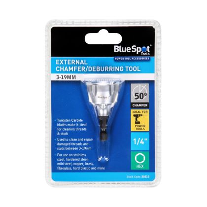 The Blue Spot Tools External Chamfer/Deburring Tool (3-19mm) is used to clean and repair the thread of a damaged threads and studs between 3-19mm. The blades are manufactured from Tungsten Carbide which is extremely hard wearing and has a very high melting point (2,600°) making it ideal for cleaning threads & studs. For use on stainless steel, hardened steel, mild steel, copper, brass, fibreglass, hard plastic and more. Ideal for use with electric drills.