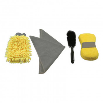 The microfibre sponge holds water efficiently and features a strap for a secure grip. Microfibre cloth absorbs water for a streak-free finish. Flexible alloy wheel brush with tough bristles to lift dirt, brake dust, and grime without damaging the wheel surface