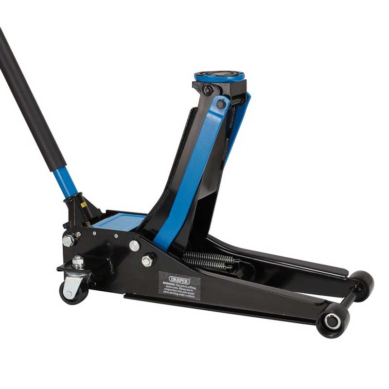 Draper Tools Low Profile 3 Tonne Trolley Jack is a heavy duty trolley jack that lift from 70 to 505mm with a powerful twin piston 8 pump 'quick-lift' feature. Integrated rubber saddle pad aids positioning and helps prevent damage. Twin safety valve prevents the jack from overloading. Knurled 114cm handgrip with EVA foam handle cover.