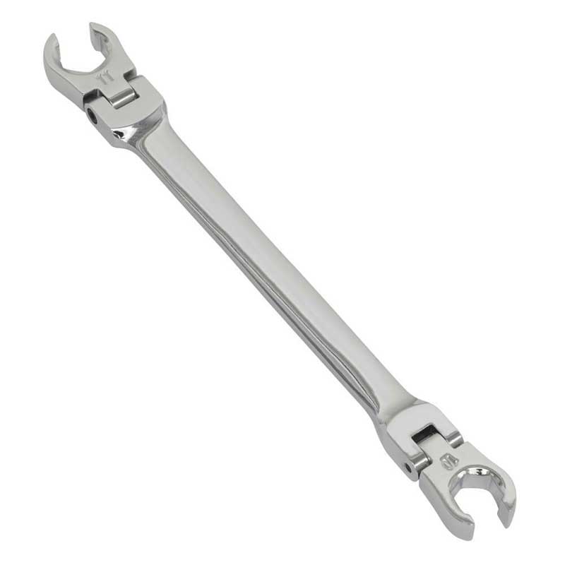 Sealey 10/11mm Flexi Head Flare Nut Spanner with flared spanner jaws for compression joint fittings. Flexible head for hard to access areas. Manufactured from hardened and tempered chrome vanadium steel.